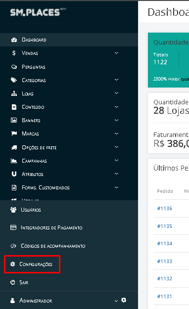 Para parametrizar a dinâmica de parcela você deve acessar o painel administrativo do marketplace e acessar o menu de Configurações: