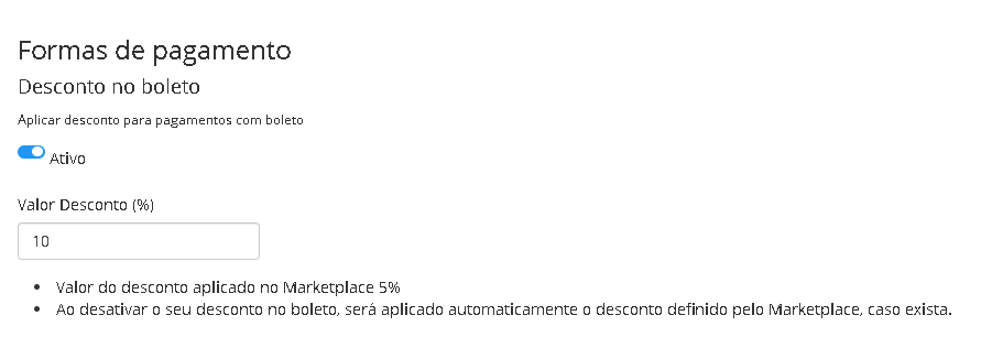 Ao desativar o seu desconto no boleto, será aplicado automaticamente o desconto definido pelo Marketplace, caso exista.