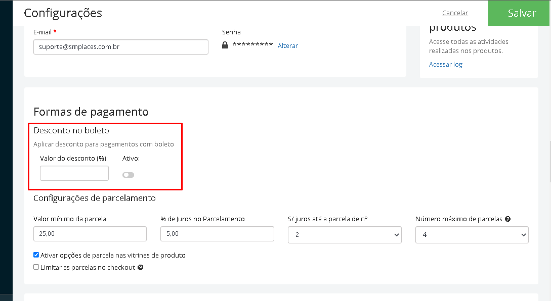 2. Insira o valor da porcentagem que a forma de pagamento boleto terá, lembrando de deixar ativo e salvar.