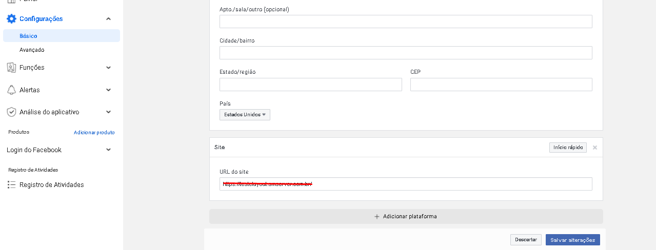 9. Agora acesse "Configurações" > Básico, no menu lateral esquerdo, na página que será aberta, desça até o final e clique em "+ Adicionar plataforma", conforme a imagem: