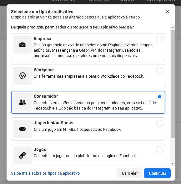 *Saiba mais sobre os tipos de aplicativo em https://developers.facebook.com/docs/development/create-an-app/app-dashboard/app-types