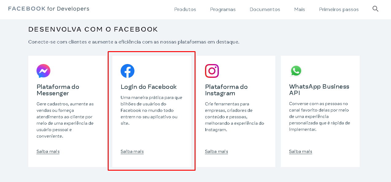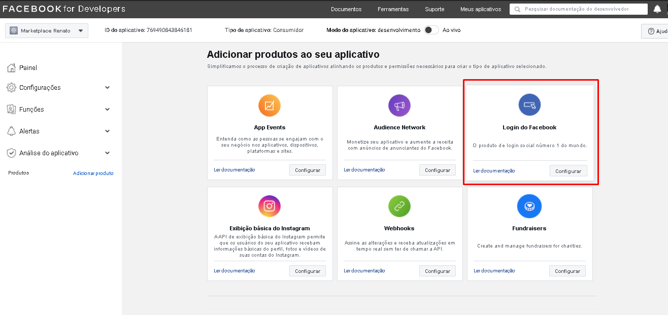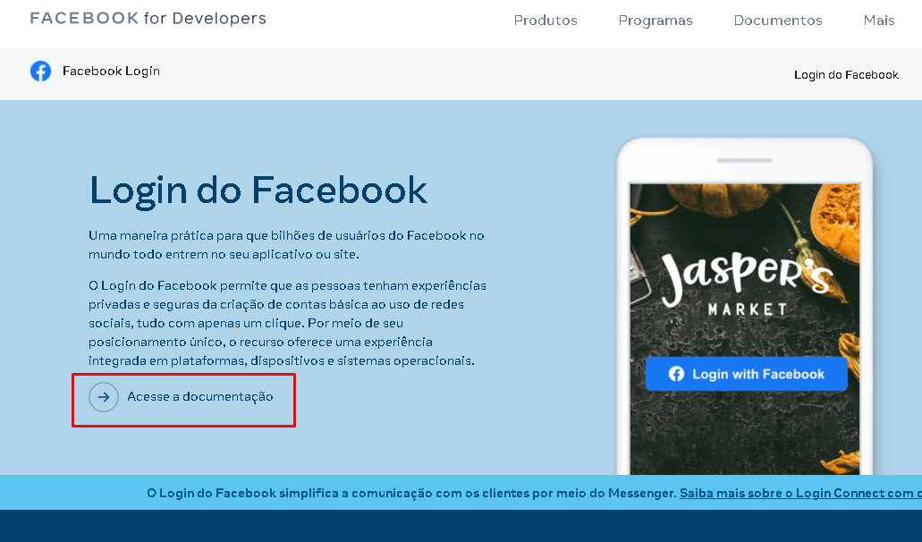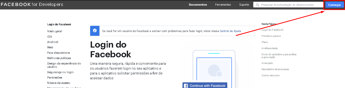 Depois acesse a opção de Login do Facebook e a documentação: