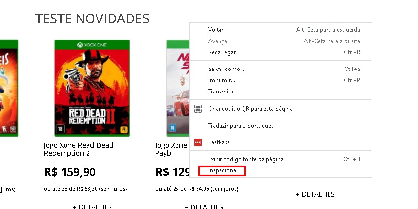 Vamos clicar com o botão direito do mouse e selecionar a opção "inspecionar" (ou Ctrl+Shift+I):